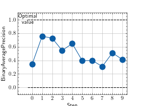 >>> # Example plotting multiple values >>> import torch >>> from torchmetrics.classification import BinaryAveragePrecision >>> metric = BinaryAveragePrecision() >>> values = [ ] >>> for _ in range(10): ... values.append(metric(torch.rand(20,), torch.randint(2, (20,)))) >>> fig_, ax_ = metric.plot(values)
