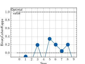 >>> from torch import rand, randint >>> # Example plotting multiple values >>> from torchmetrics.classification import BinaryCohenKappa >>> metric = BinaryCohenKappa() >>> values = [ ] >>> for _ in range(10): ... values.append(metric(rand(10), randint(2,(10,)))) >>> fig_, ax_ = metric.plot(values)