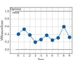 >>> # Example plotting multiple values >>> import torch >>> from torchmetrics.clustering import VMeasureScore >>> metric = VMeasureScore() >>> values = [ ] >>> for _ in range(10): ... values.append(metric(torch.randint(0, 4, (10,)), torch.randint(0, 4, (10,)))) >>> fig_, ax_ = metric.plot(values)