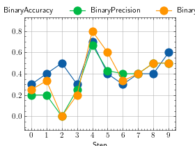 >>> # Example plotting multiple values >>> import torch >>> from torchmetrics import MetricCollection >>> from torchmetrics.classification import BinaryAccuracy, BinaryPrecision, BinaryRecall >>> metrics = MetricCollection([BinaryAccuracy(), BinaryPrecision(), BinaryRecall()]) >>> values = [] >>> for _ in range(10): ... values.append(metrics(torch.rand(10), torch.randint(2, (10,)))) >>> fig_, ax_ = metrics.plot(values, together=True)