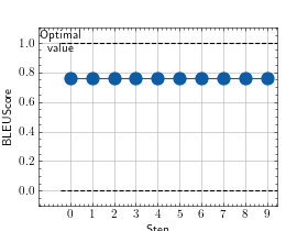 >>> # Example plotting multiple values >>> from torchmetrics.text import BLEUScore >>> metric = BLEUScore() >>> preds = ['the cat is on the mat'] >>> target = [['there is a cat on the mat', 'a cat is on the mat']] >>> values = [ ] >>> for _ in range(10): ... values.append(metric(preds, target)) >>> fig_, ax_ = metric.plot(values)